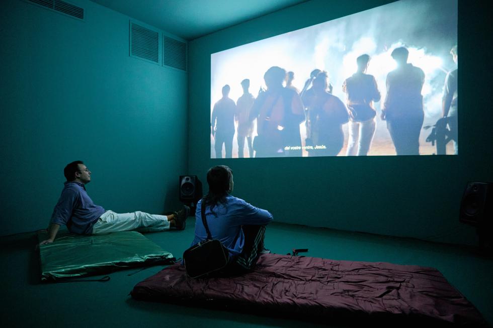 Junto al audiovisual, el proyecto se expande en la Sala Negre a través de dos piezas formadas por colchonetas bordadas a mano que remiten a los momentos de descanso y espera propios del camino al Rocío, y que introducen una dimensión material que conecta con prácticas tradicionalmente vinculadas al trabajo femenino, al cansancio, al deseo y a la resistencia.