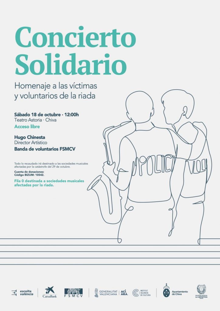 El Institut Valencià de Cultura, en colaboración con CaixaBank, a través del programa ‘CaixaBank escolta València’; y la Federación de Sociedades Musicales de la Comunitat Valenciana (FSMCV) organizan un concierto extraordinario para rendir homenaje a las víctimas, damnificados y a todos los profesionales y voluntarios que desempeñaron un papel crucial durante la catástrofe que asoló Valencia el pasado 29 de octubre de 2024.