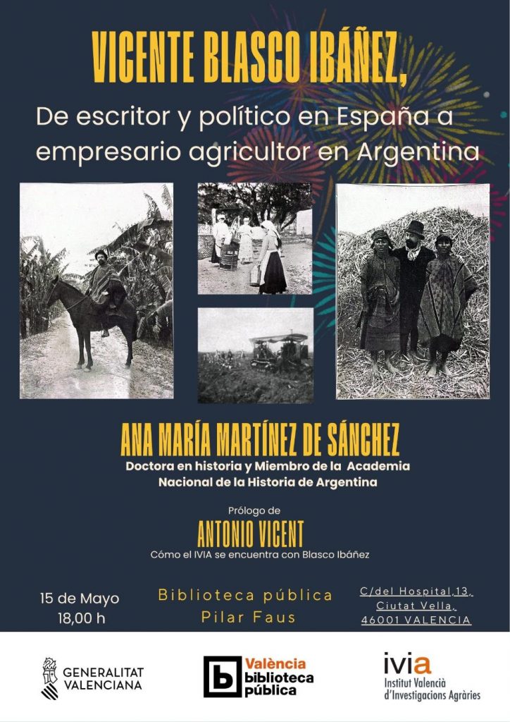 El Instituto Valenciano de Investigaciones Agrarias (IVIA), en colaboración con la Biblioteca Pública Pilar Faus, organiza una conferencia dedicada a la figura de Blasco Ibáñez, que lleva por título ‘Vicente Blasco Ibáñez, de escritor y político en España a empresario agricultor en Argentina’.