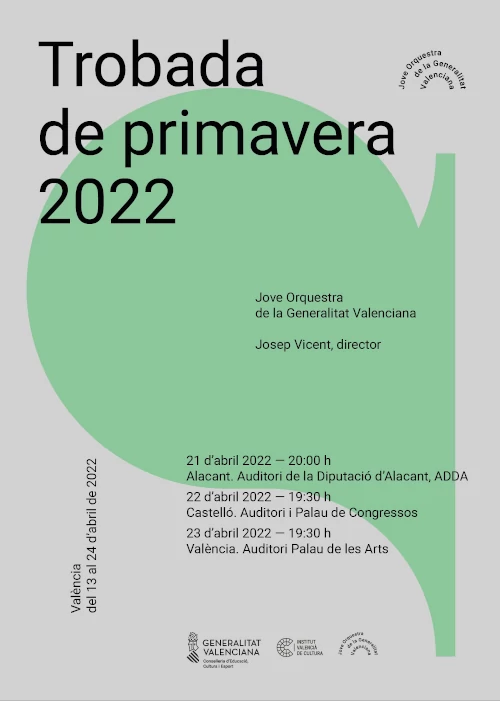 - El Encuentro de Primavera de la Jove Orquestra concluirá con tres conciertos: el 21 de abril en el Auditorio de la Diputación de Alicante (ADDA), el 22 de abril en Castelló de la Plana y el 23 de abril en el Palau de les Arts